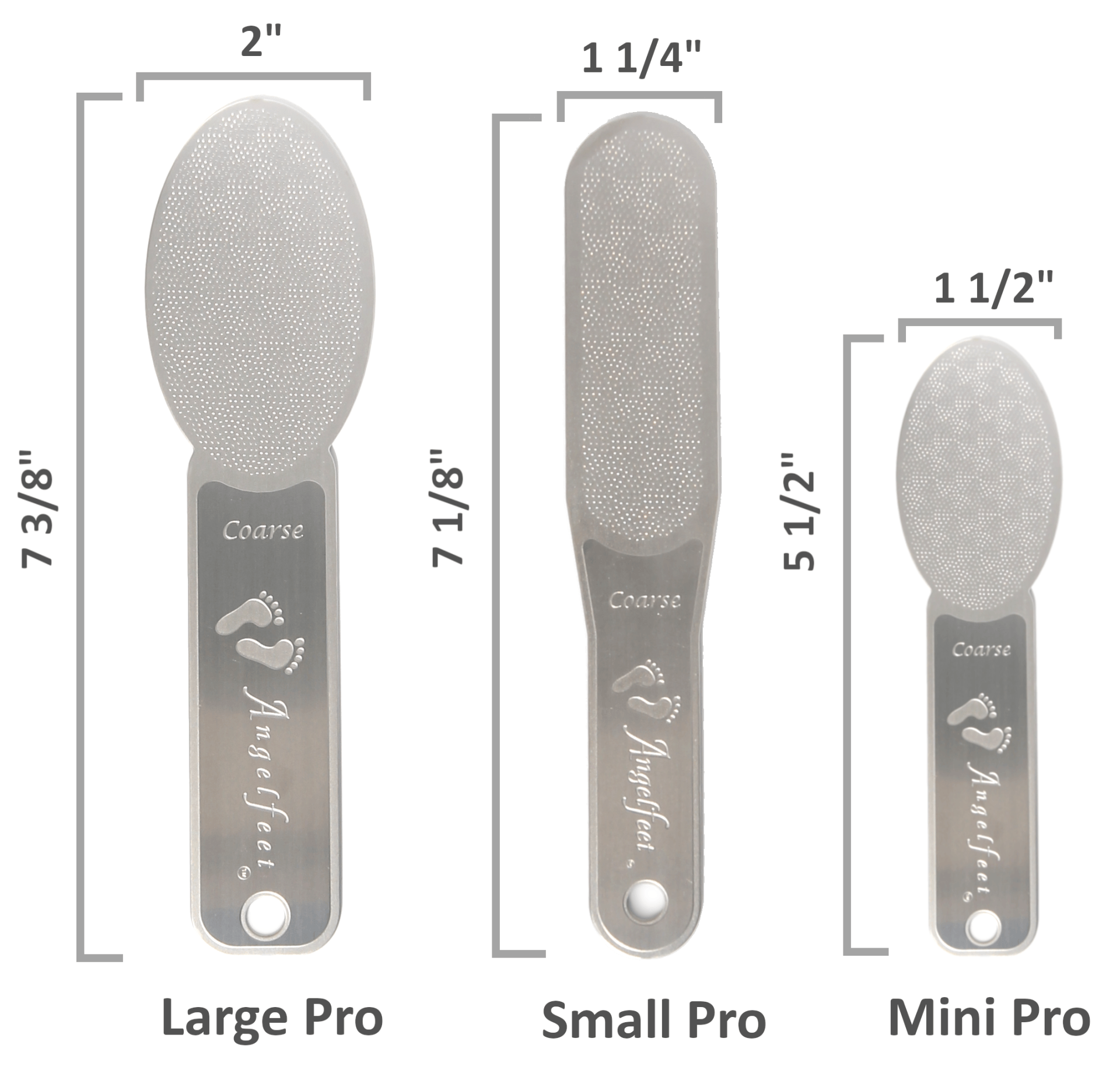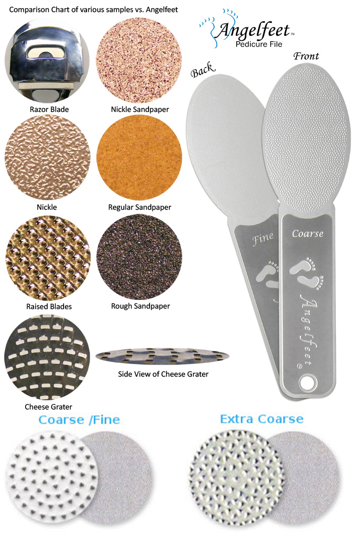 Our foot files have a unique design and architecture, which make them one of a kind. The safety of an AngelFeet file is unparalleled because, unlike ordinary pedicure files, the AngelFeet collection contains no cutting blades or sharp edges . Our files are etched out of a single piece of surgical-grade stainless steel. We create a surface of thousands of pyramids to safely remove dry, cracked and calloused skin. This technology makes the pedicure fast, safe and easy to perform, without cutting or grating the skin. Other files made of metal, paper or cloth substrates have many negative attributes that do not allow them to be sterilized and can cause damage to the skin.